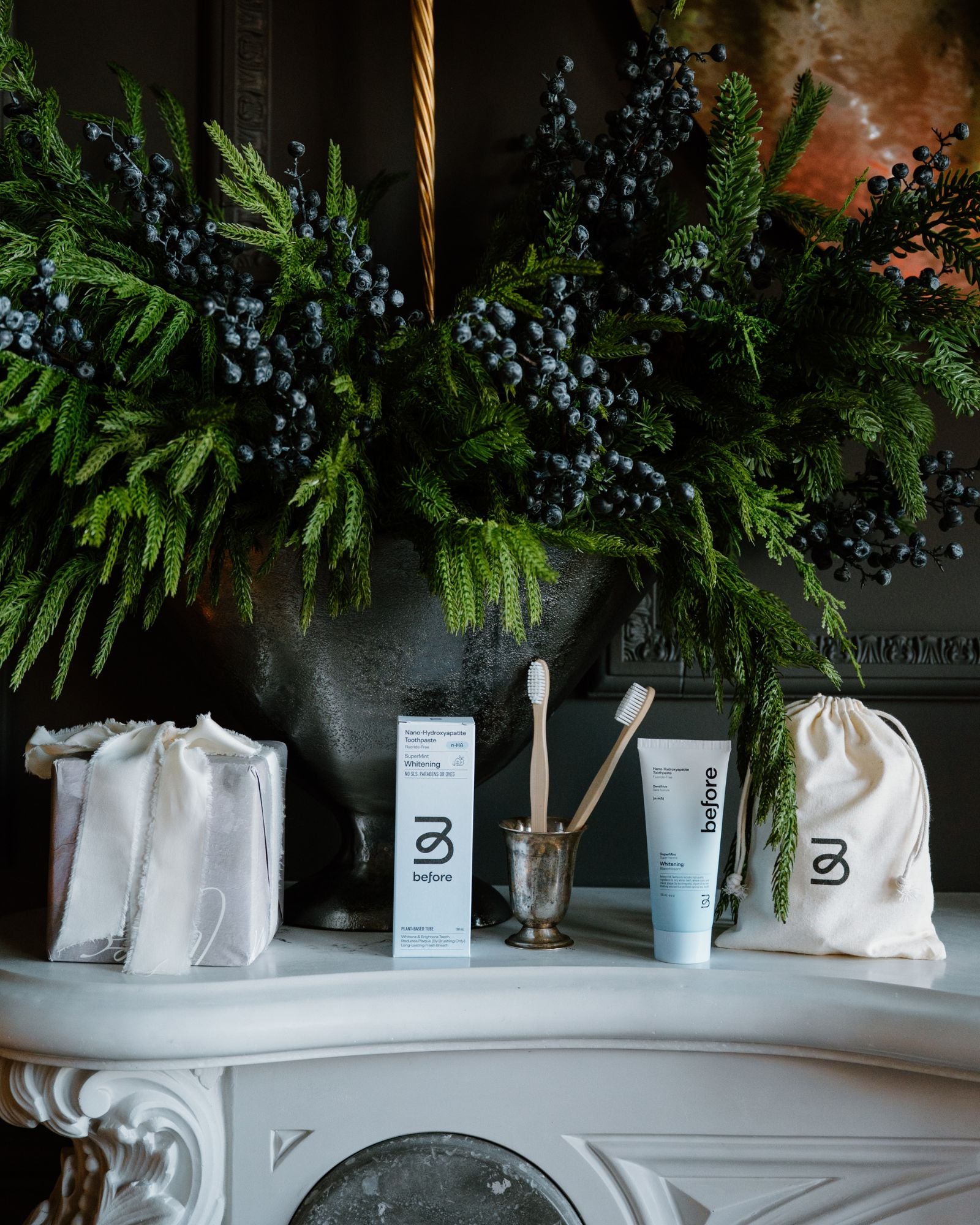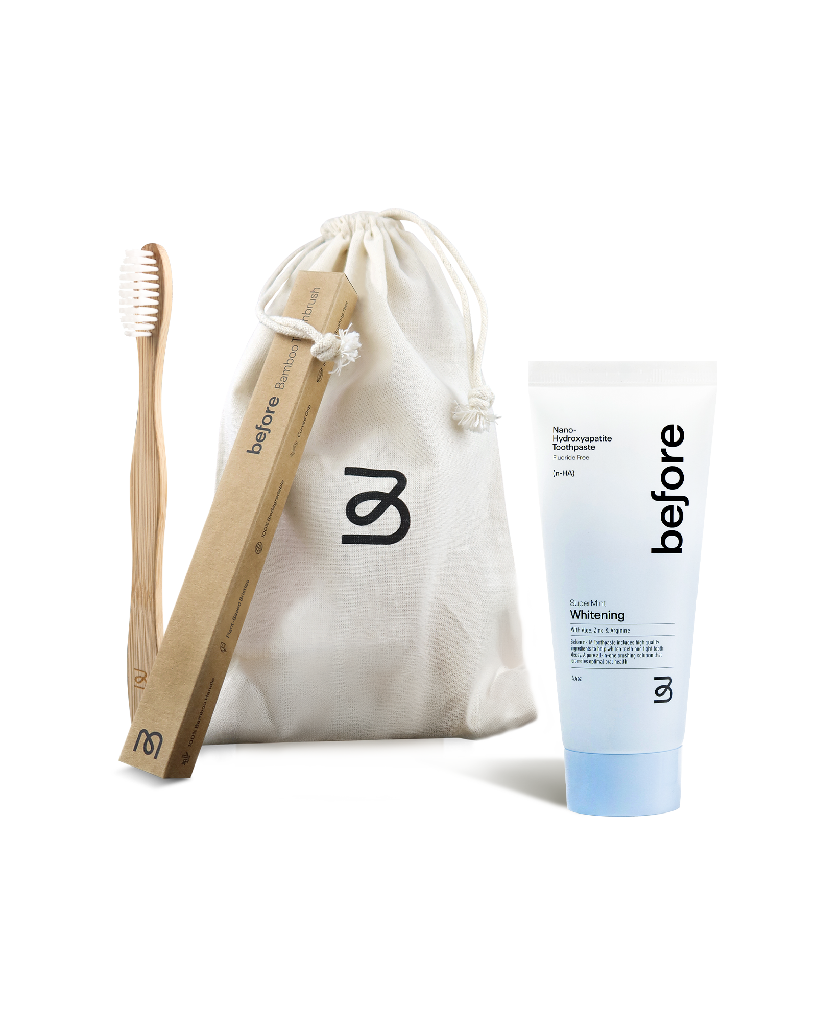 Upgrade your everyday routine with a clean set made to brighten, strengthen, and simplify. Inside, you’ll find our Nano-Hydroxyapatite (n-HA) SuperMint Whitening Toothpaste, a sustainable bamboo toothbrush, and a reusable cotton pouch for travel or gifting.
