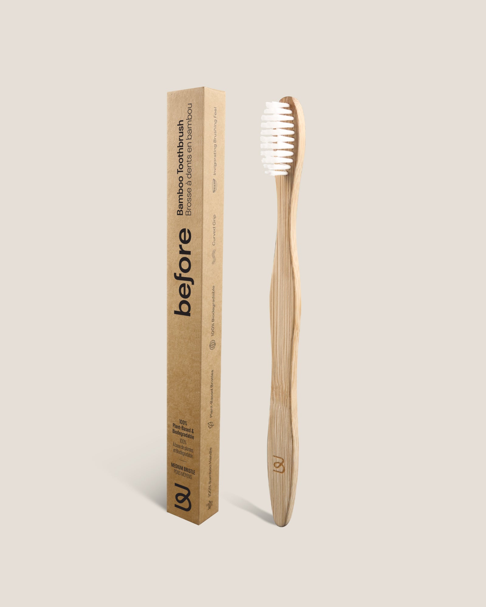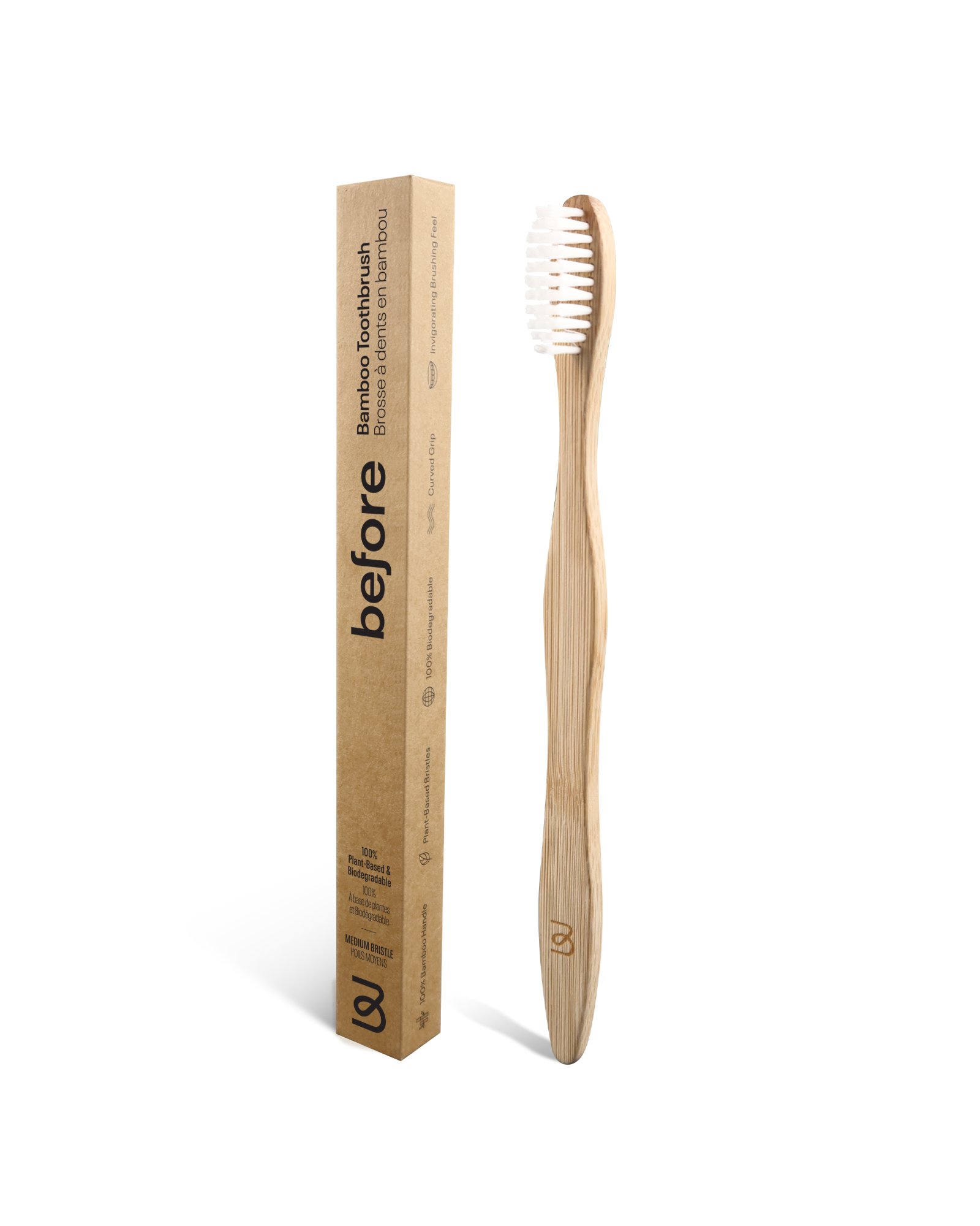 Now that’s a plush brush! Our bamboo toothbrush is designed to feel great in the hand and even better on your teeth, with medium/soft plant-based bristles that are tough on stains and plush on your gums. With a curved grip and 4 rows of bristles, the Before Toothbrush makes fighting plaque and gingivitis a breeze with your favourite Before Toothpaste.