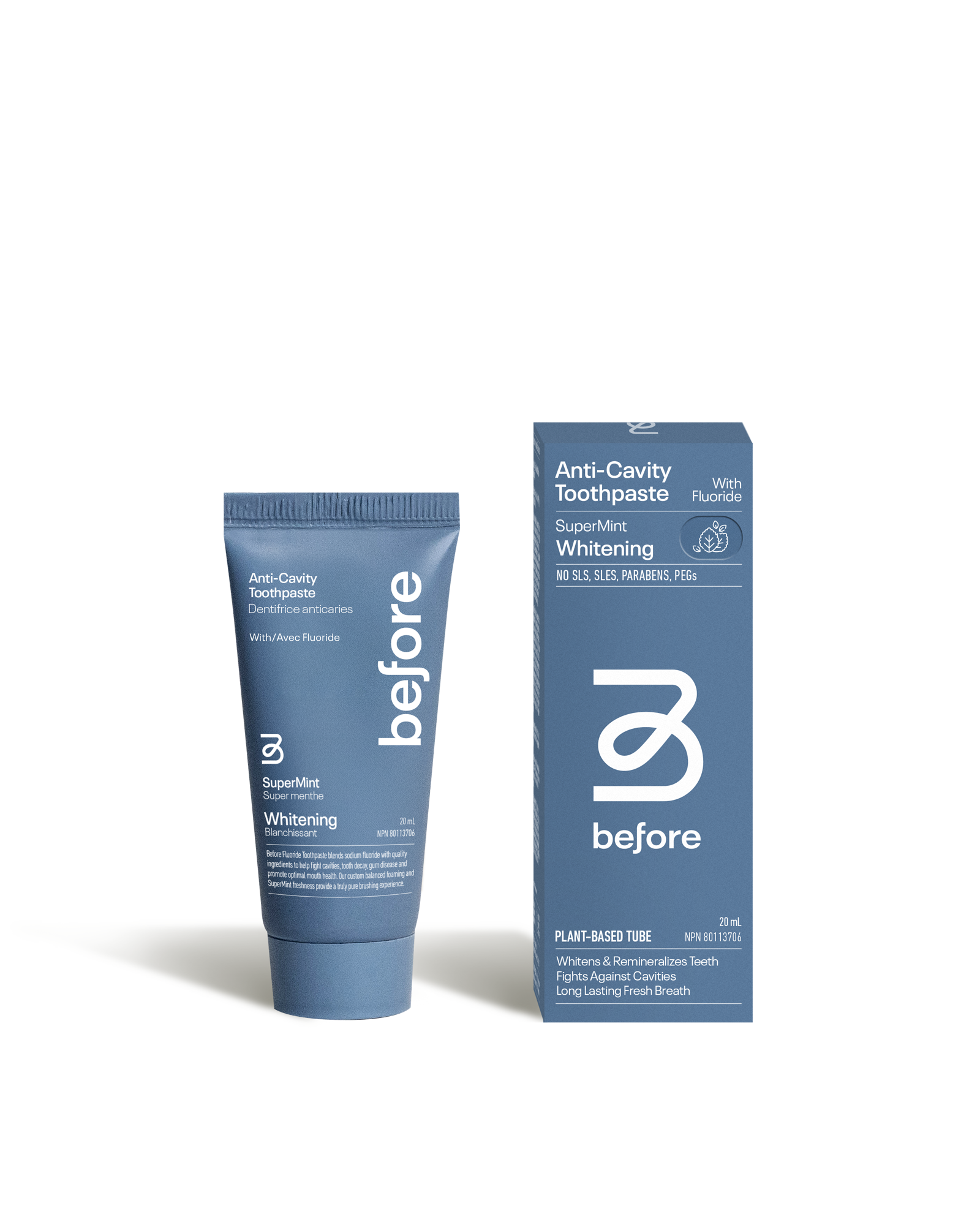 Incredible taste and incredibly clean, Before’s award winning natural Whitening Toothpaste gradually and safely brightens your teeth with our custom blend of high-quality ingredients and sodium fluoride. Upgrade your brushing routine with our perfectly balanced foaming, soothing Supermint flavour and silky low-abrasion texture. Fight cavities, remineralize your tooth enamel, and level up your mouth health without harmful chemicals and synthetic ingredients.