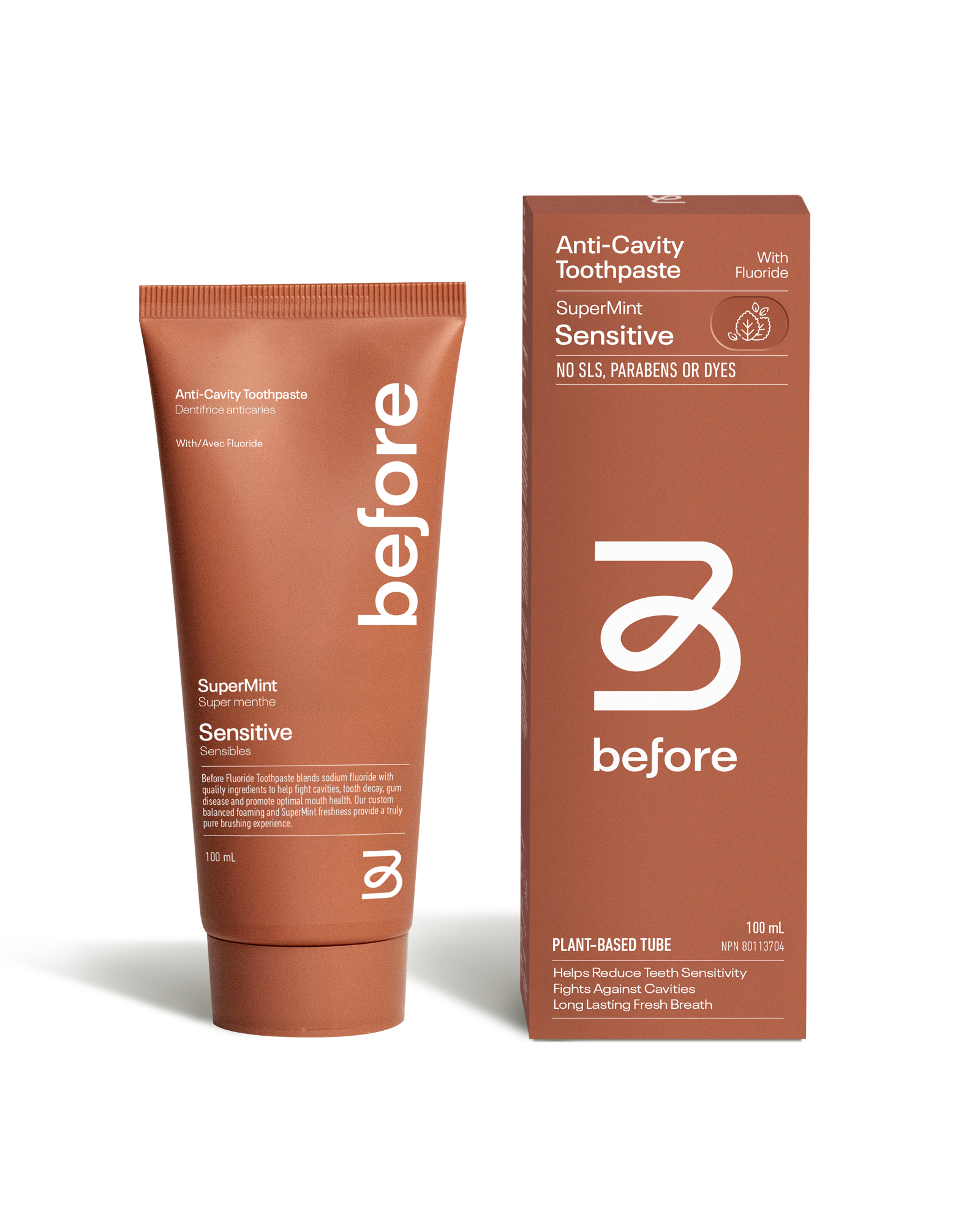 Breathe in and say goodbye to sensitive teeth. Before’s award winning natural Sensitive Toothpaste soothes unpleasant teeth and gum sensitivity with our custom blend of high-quality ingredients and sodium fluoride. Upgrade your brushing routine with our perfectly balanced foaming, soothing Supermint flavour and silky low-abrasion texture. Fight cavities, remineralize your tooth enamel, and level up your mouth health without harmful chemicals and synthetic ingredients.